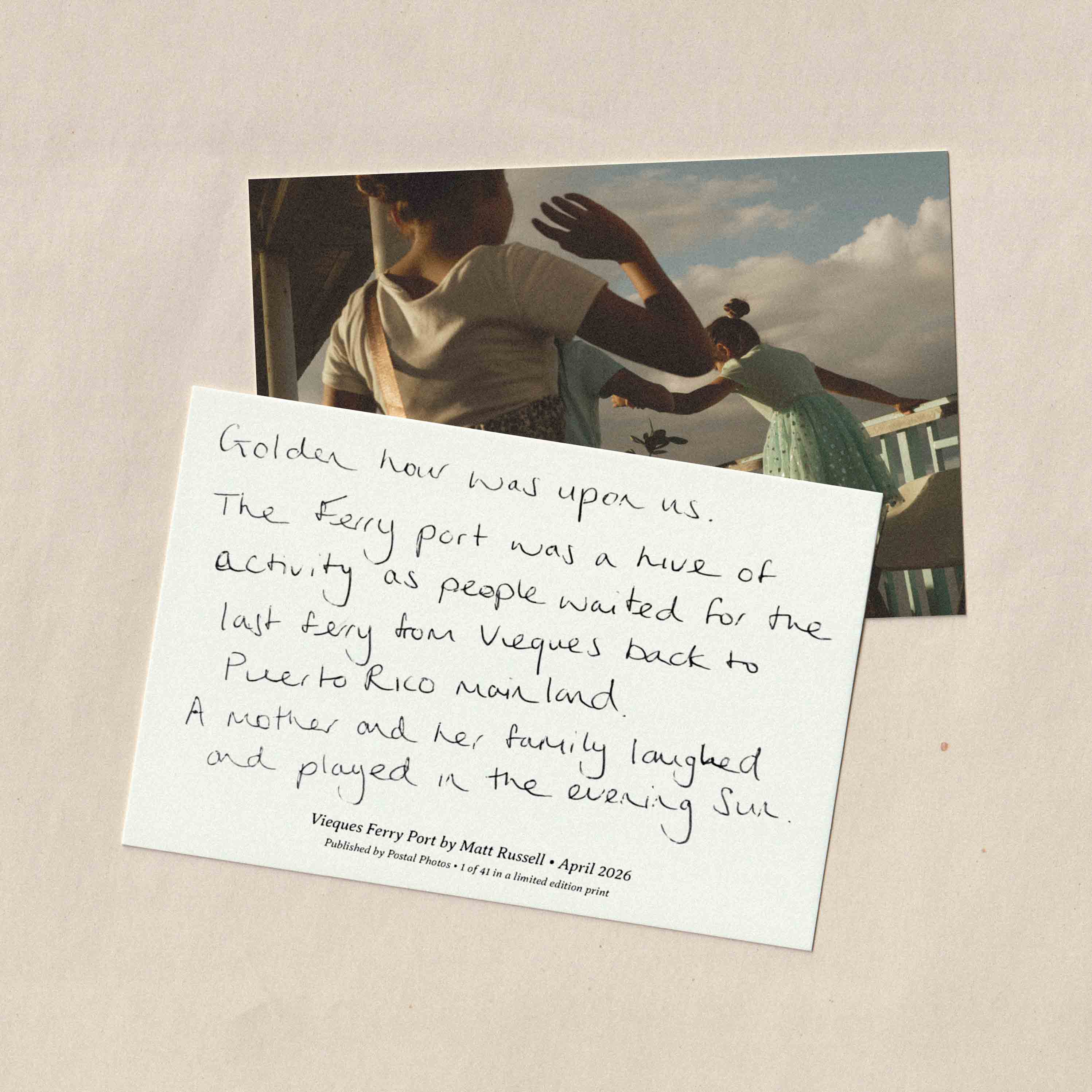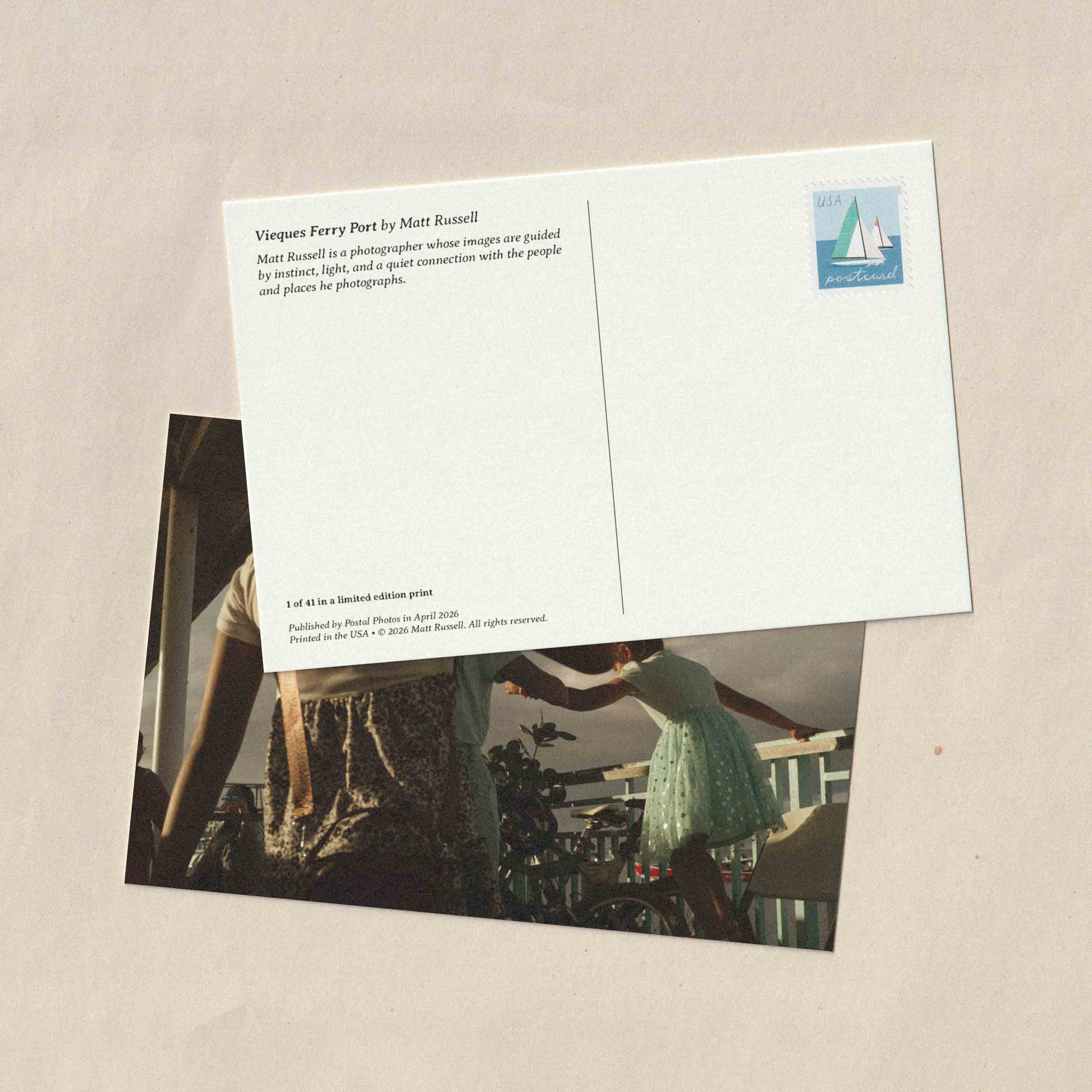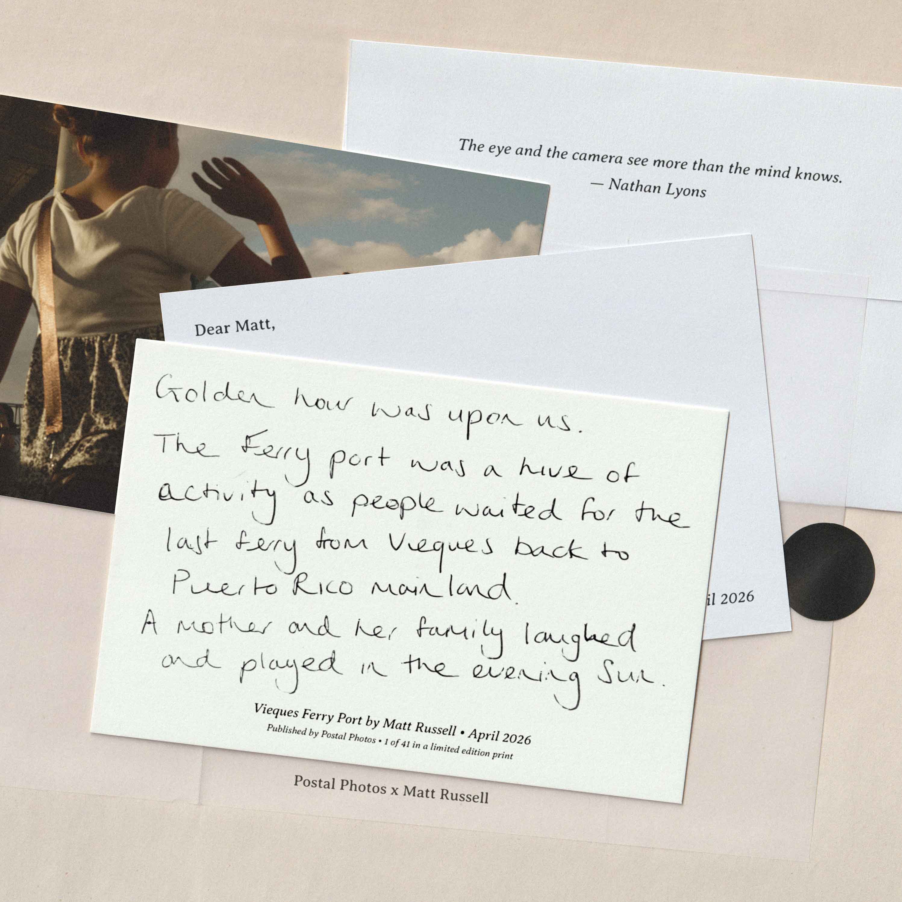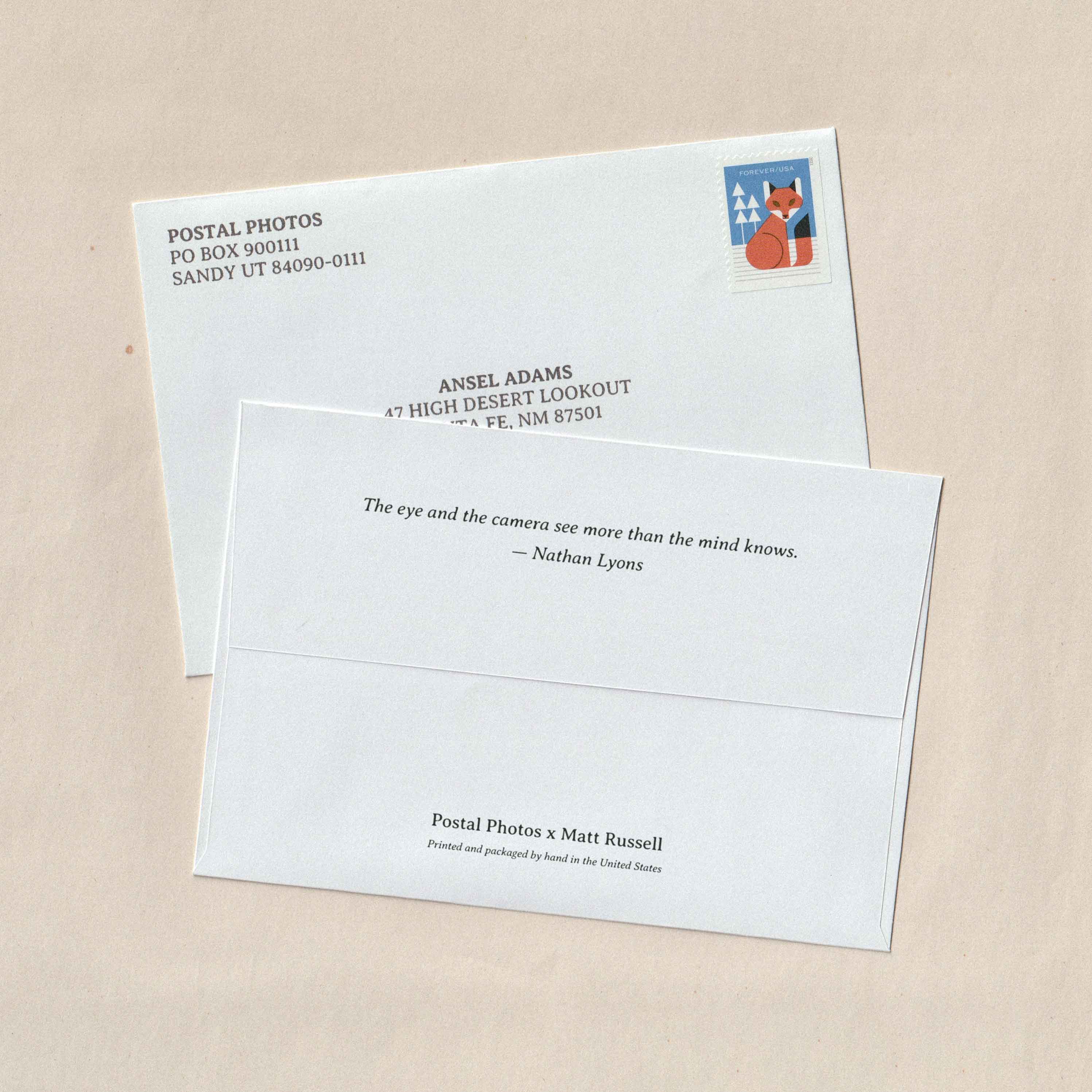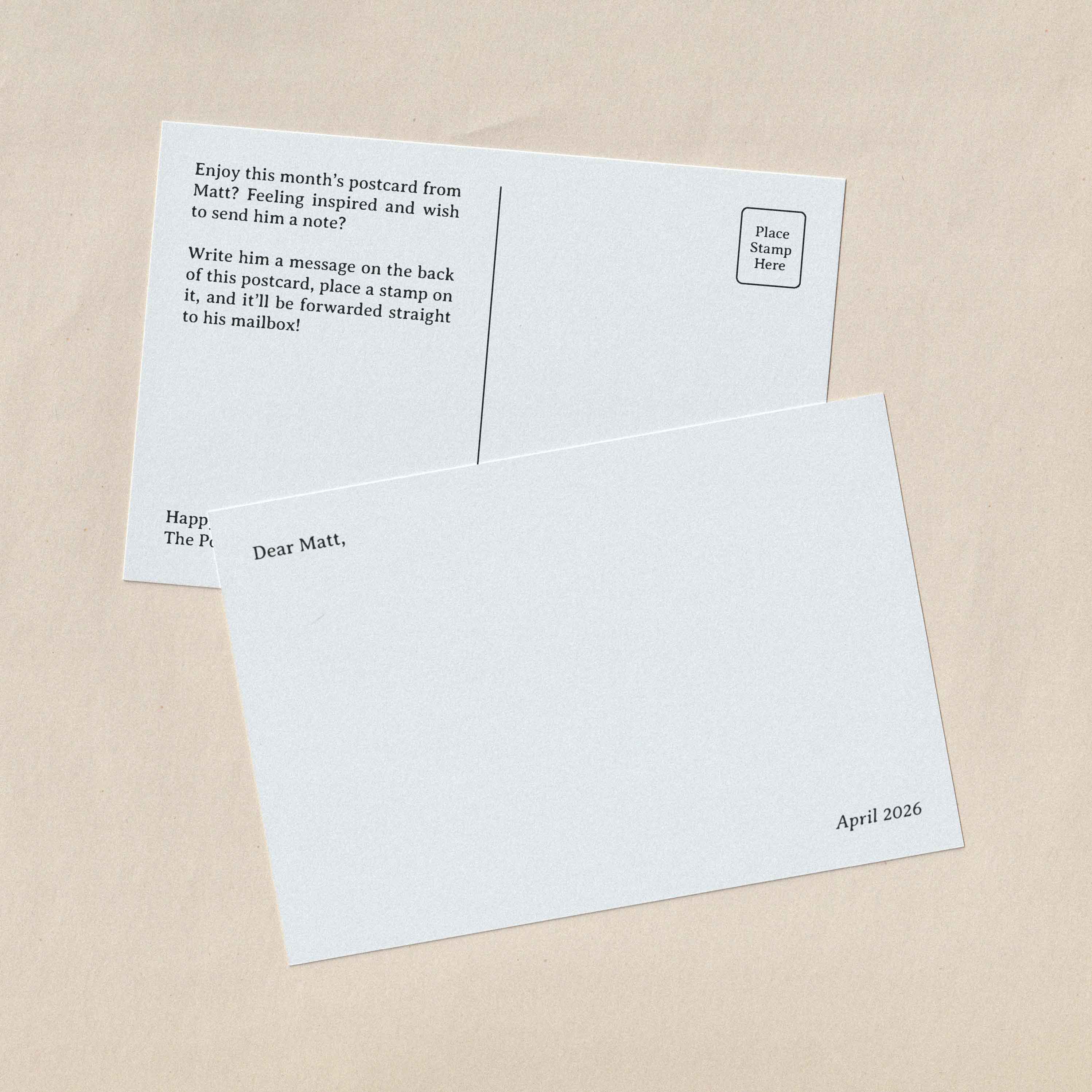 Each month, Matt will curate and mail one of his favorite photographs to you on a premium quality, limited edition postcard. In addition to being packaged by hand, each postcard will be shipped in an envelope to ensure safe delivery to your mailbox. Matt will also provide a return postcard so you can write back to him and connect via letter mail.