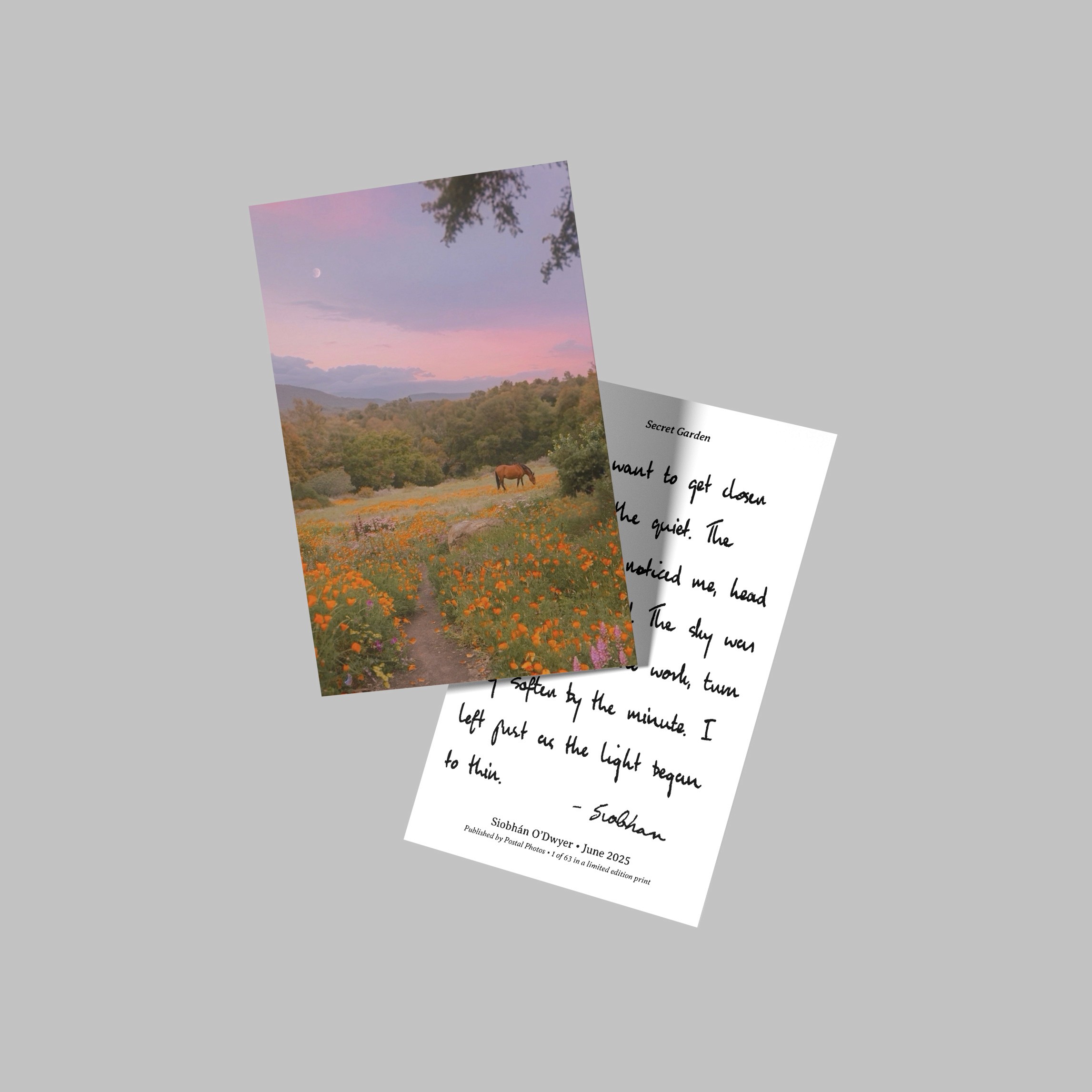 Each month, Siobhán will curate and mail one of her favorite photographs to you on a premium quality, limited edition postcard. In addition to being packaged by hand, each postcard will be shipped in an envelope to ensure safe delivery to your mailbox. Siobhán will also provide a return postcard so you can write back to her and connect via letter mail.
