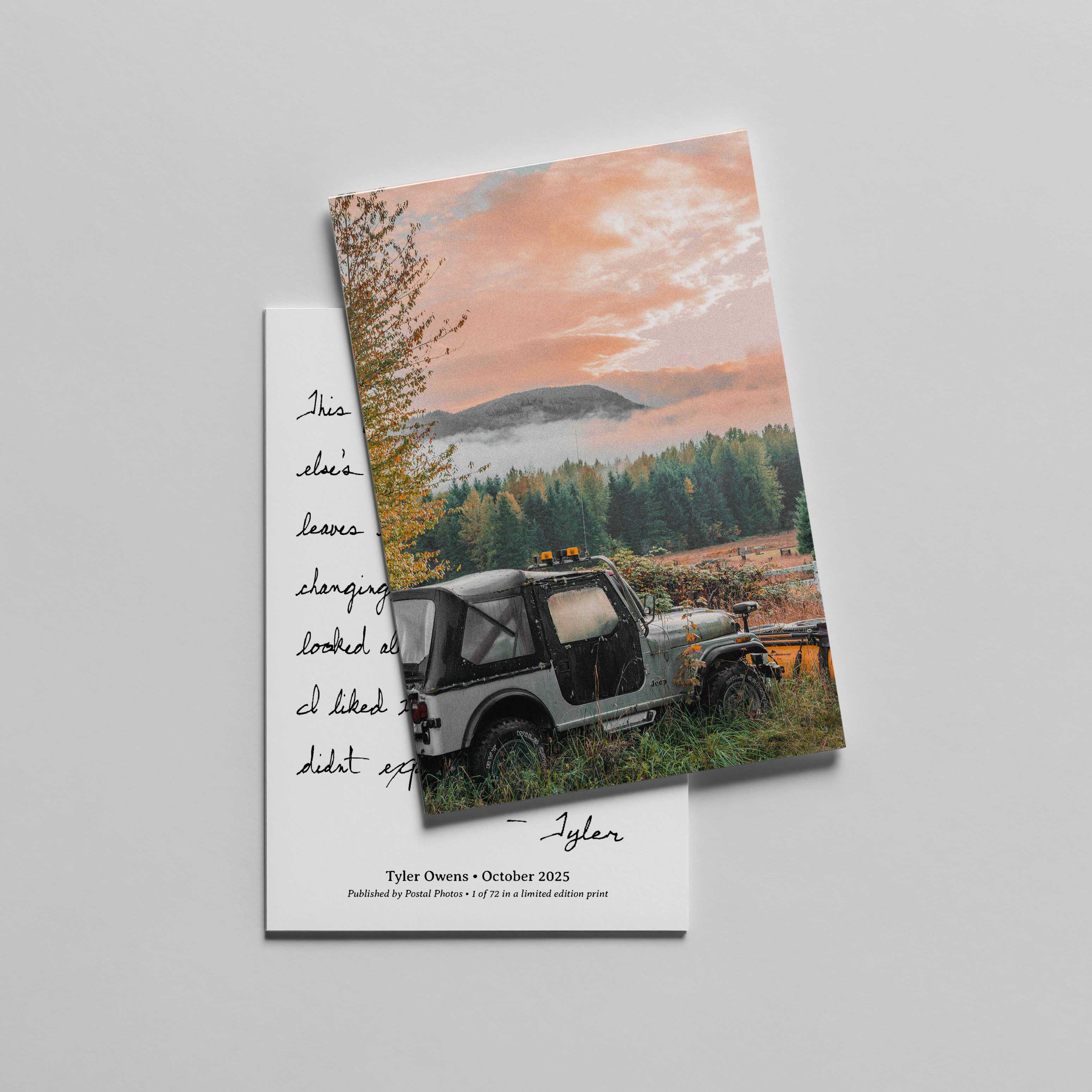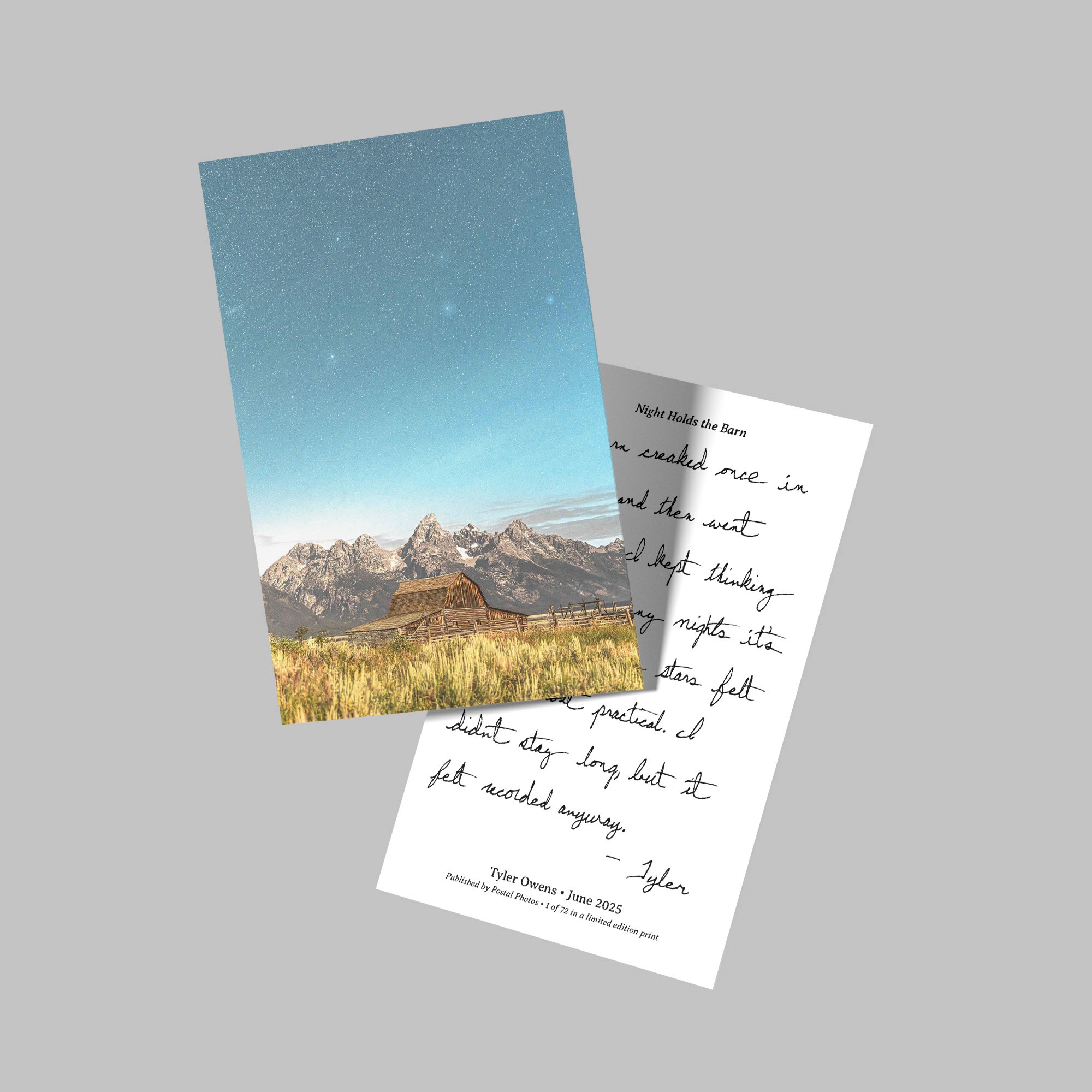 Each month, Tyler will curate and mail one of his favorite photographs to you on a premium quality, limited edition postcard. In addition to being packaged by hand, each postcard will be shipped in an envelope to ensure safe delivery to your mailbox. Tyler will also provide a return postcard so you can write back to him and connect via letter mail.